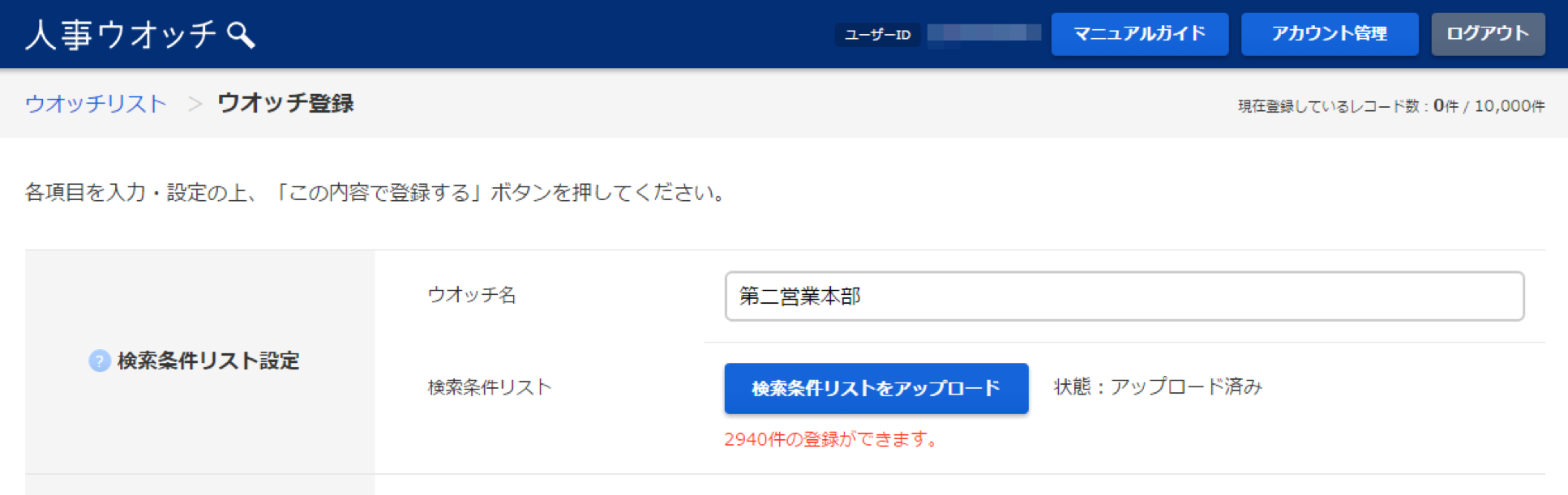 検索条件リストをアップロードいただくことで、検索条件を一括でご登録いただけます。