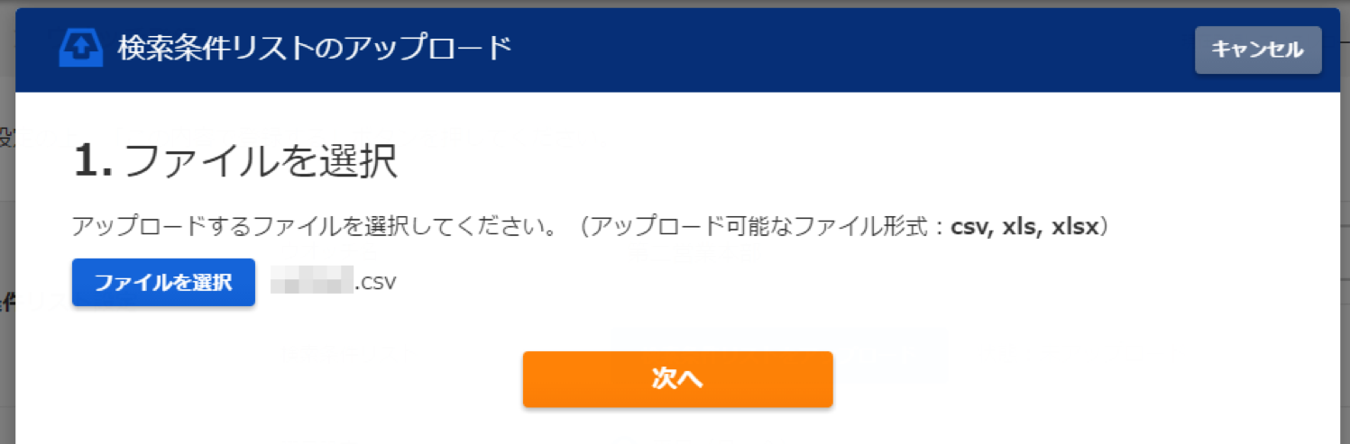 ボタン[検索条件リストのアップロード]をクリックするとアップロード画面が開きます。
