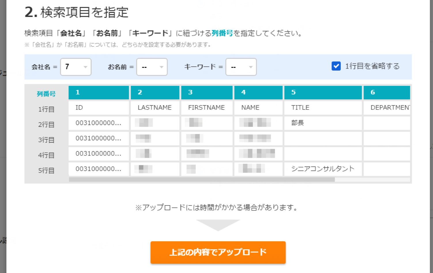 プルダウンから、検索項目「会社名」「氏名」「キーワード」に紐づける列番号を指定してください。