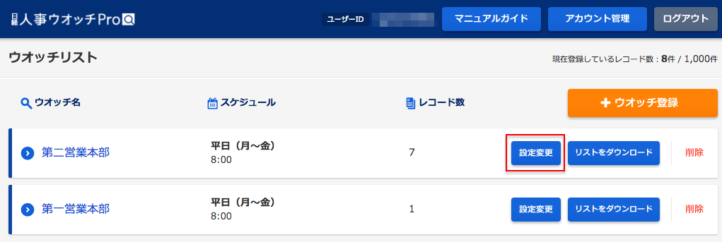 ウオッチを登録後に設定を変更する場合は、ウオッチリストまたは検索結果画面の[設定変更]より登録画面へお進みください。