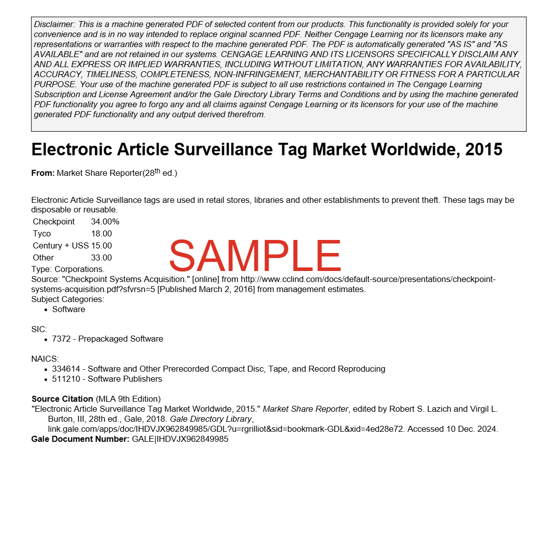 Market Share Reporterは、定期刊行物から市場シェアレポートを集めたもので、競合分析、市場調査、その他の経済分析および政策分析に活用できる独自のリソースです。SICコードおよびNAICSコードの両方の下で整理された3,600を超える種類のレポートとなっており、企業、ブランド、製品、サービス、および商品の市場シェアをカバーしています。
